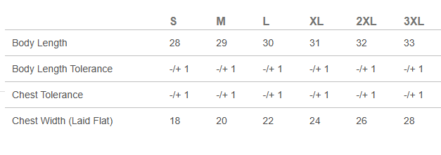 Description 5.3 oz./yd² (US) 8.8 oz./L yd (CA), 100% cotton, 20 singles Classic fit Rib collar Taped neck and shoulders for comfort and durability Tear away label Size Chart:
